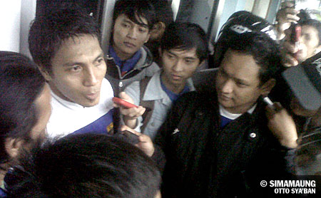 Isnan Ali (kiri) Kemarin (24/08) ketika diwawancarai wartawan, termasuk Simamaung seusai latihan sore di Lapangan UPI, Bandung.